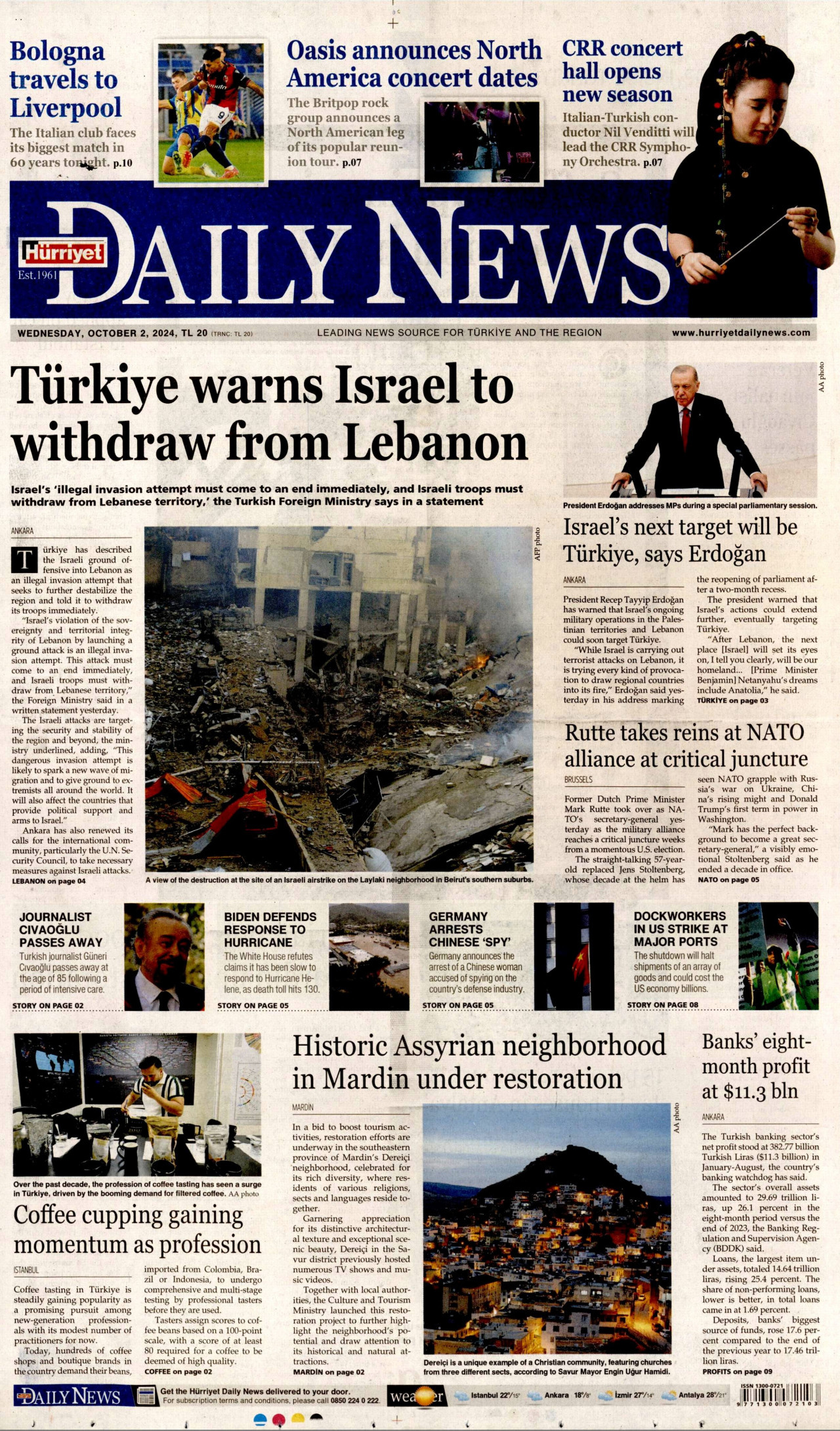 HÜRRİYET DAİLY NEWS Gazetesi 02 Ekim 2024, Çarşamba Günü Manşeti