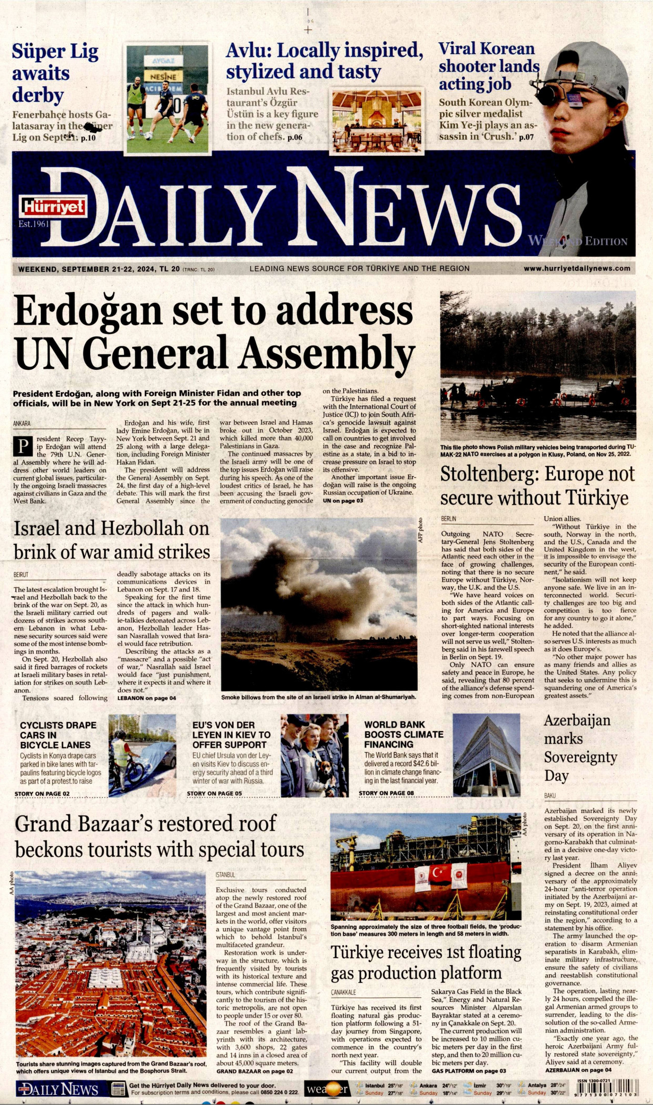 HÜRRİYET DAİLY NEWS Gazetesi 21 Eylül 2024, Cumartesi Günü Manşeti