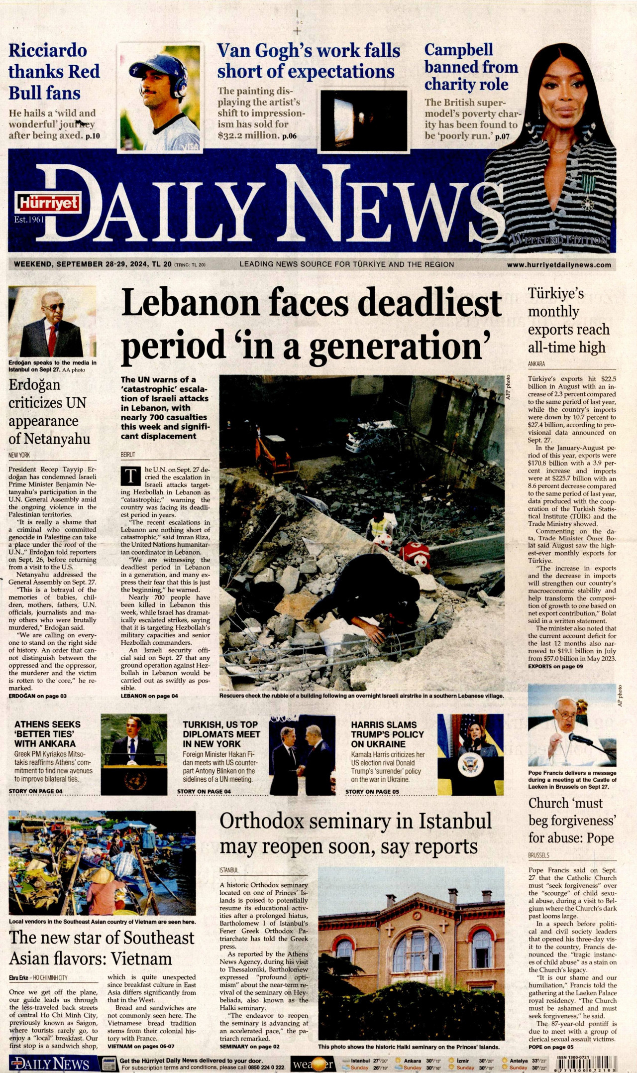 HÜRRİYET DAİLY NEWS Gazetesi 28 Eylül 2024, Cumartesi Günü Manşeti