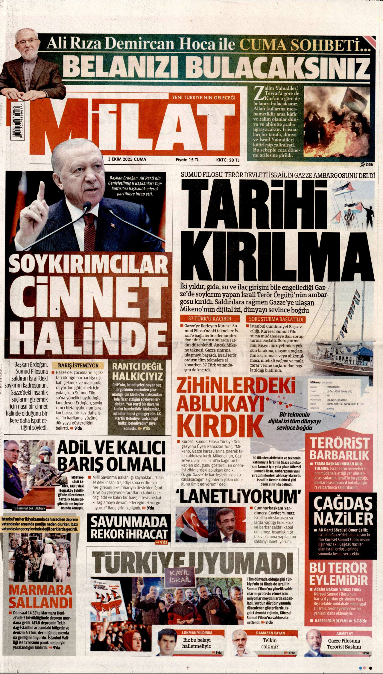 MİLAT Gazetesi 03 Ekim 2025, Cuma Günü Manşeti